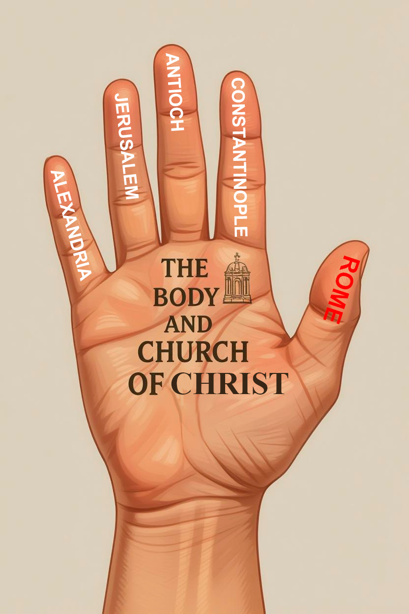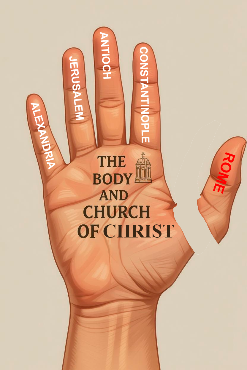 Let’s pretend that the early church, the initial body of Christ is a hand with four fingers and a thumb. Each digit represents one of the primary Patriarchates that existed in the first millenia. You can see my wonderful attempts at art below that illustrates this concept. Why did I put Rome on the thumb and not the index finger? Because Rome was all the way out in the West, somewhat isolated geographically from the other patriarchates. The other four were relatively close to each other and maintained more regular correspondence.