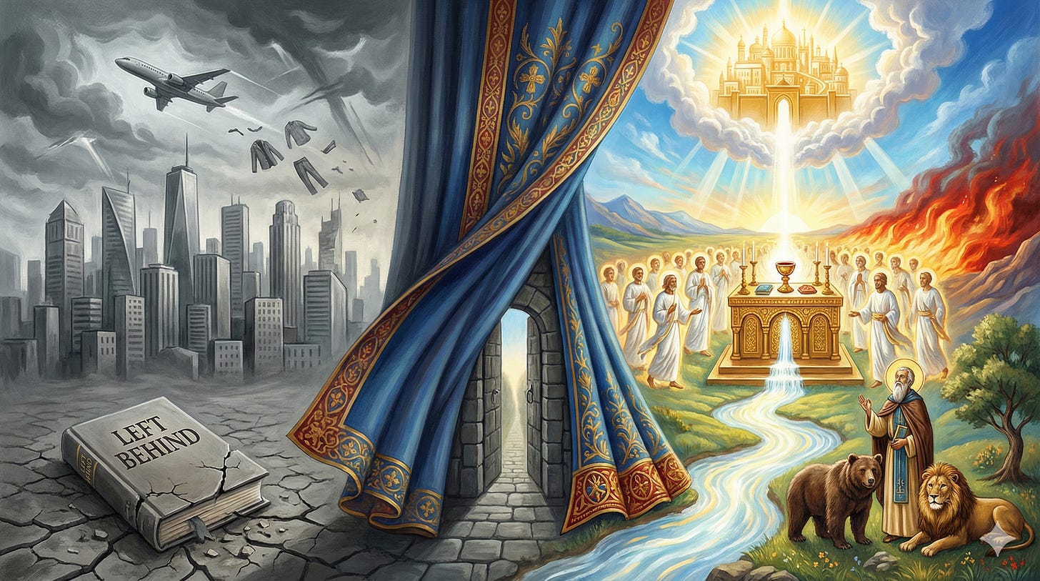 This is the Rapture, as imagined by the Left Behind franchise, the most commercially successful depiction of the evangelical conception of the “end times” in American history. Sixteen novels. Four films. Tens of millions of copies sold. And behind it, a theological framework so thoroughly embedded in American Protestantism that most churchgoers assume it comes straight from the Bible.