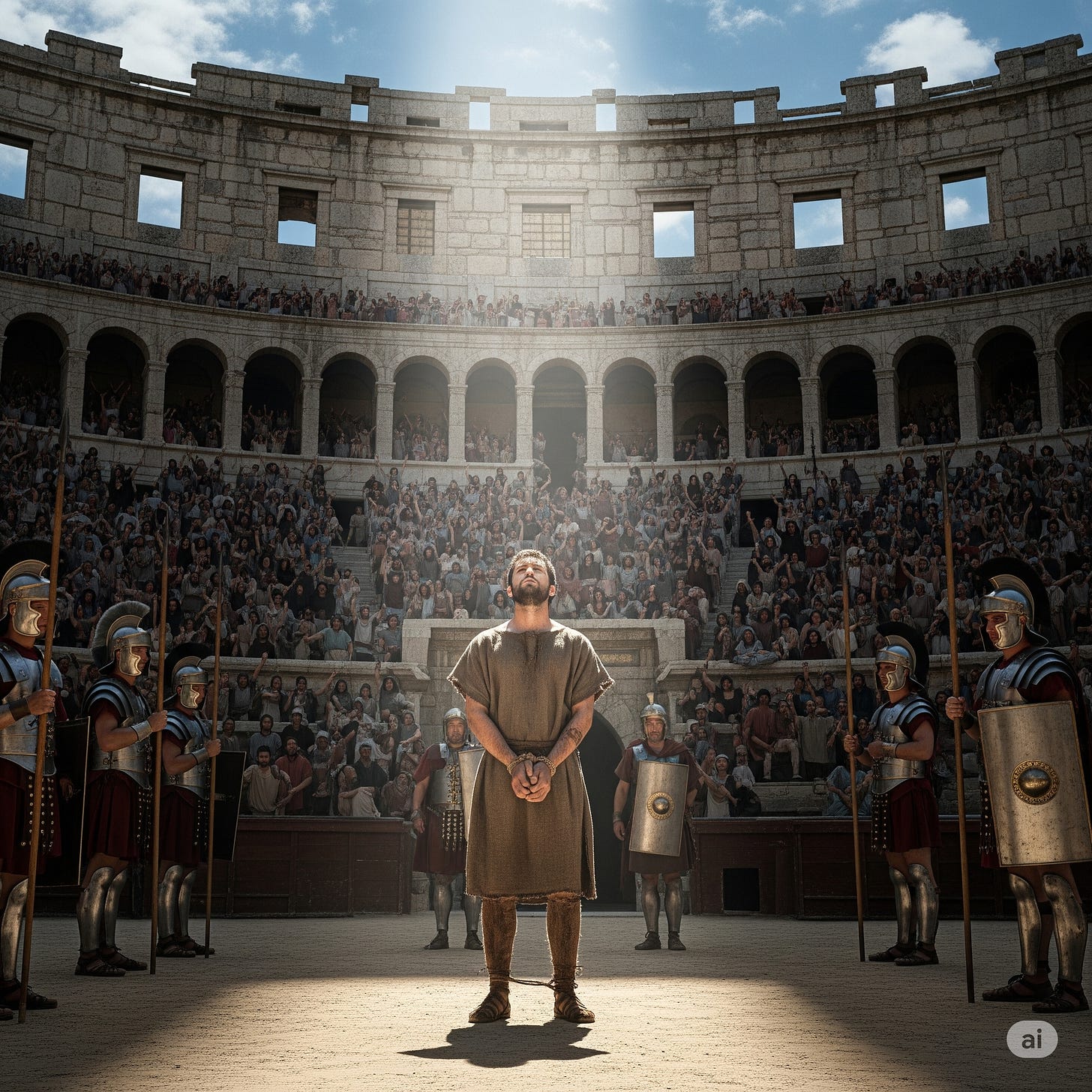 The midday sun beats down on the stone of a Roman amphitheater nestled in the greenery of Roman Gaul. The harsh light glints off the polished helmets of the guards and the sweat-slicked faces of the jeering crowd. A thousand voices in a single monstrous roar reverberate through the open air; a terrible sound filled with bestial bloodlust and demented celebratory glee.