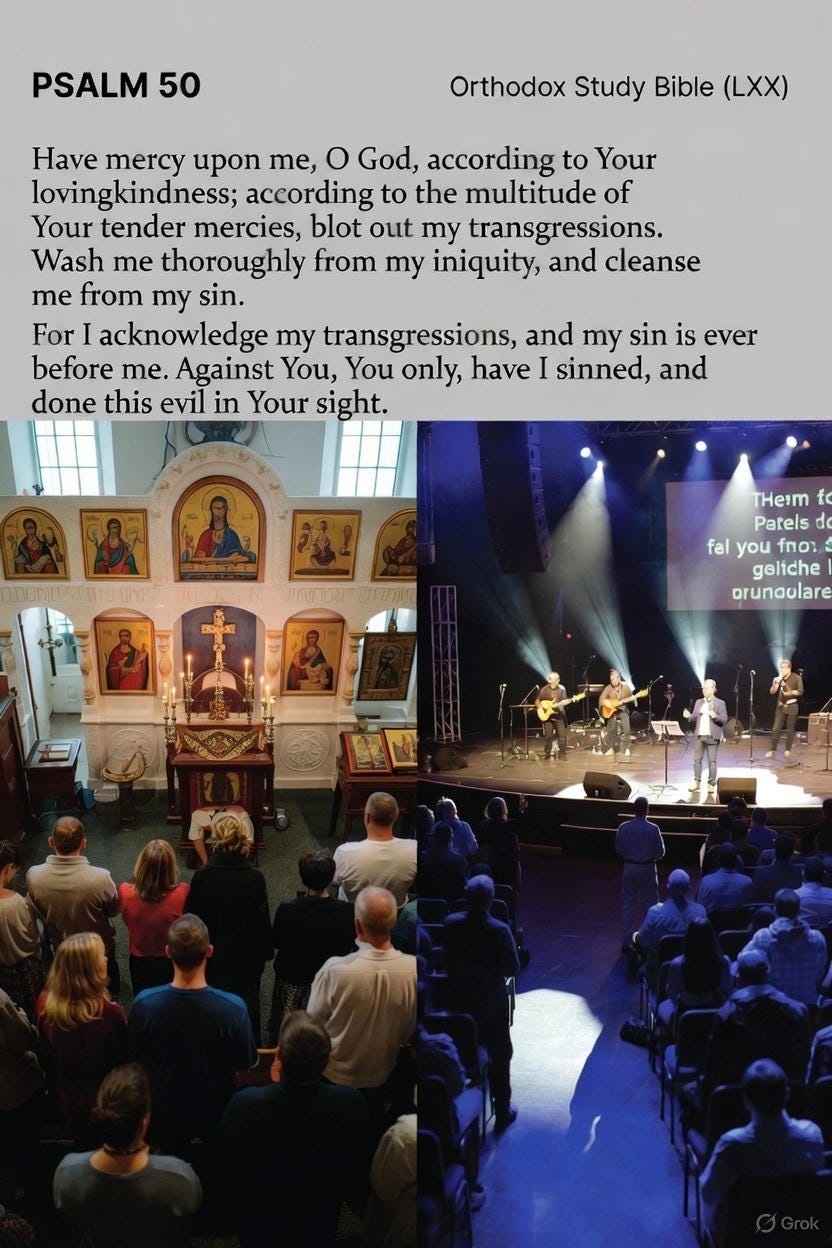 Dear readers, please heed Psalm 50’s final triumph: “O Lord, open my lips, and my mouth shall show forth Your praise” (v. 15). Step beyond the stage’s glow, or the pulpit's proclamations, into the altar’s shadow—visit a Divine Liturgy, stand in its ancient rhythm, and offer your heart. In that sacred space, you will not find fleeting emotion, but eternal embrace: Christ Himself, who turns our ashes into Alleluias. For in His mercy, the broken are made whole, and worship becomes not what we consume, but the song of souls set free.